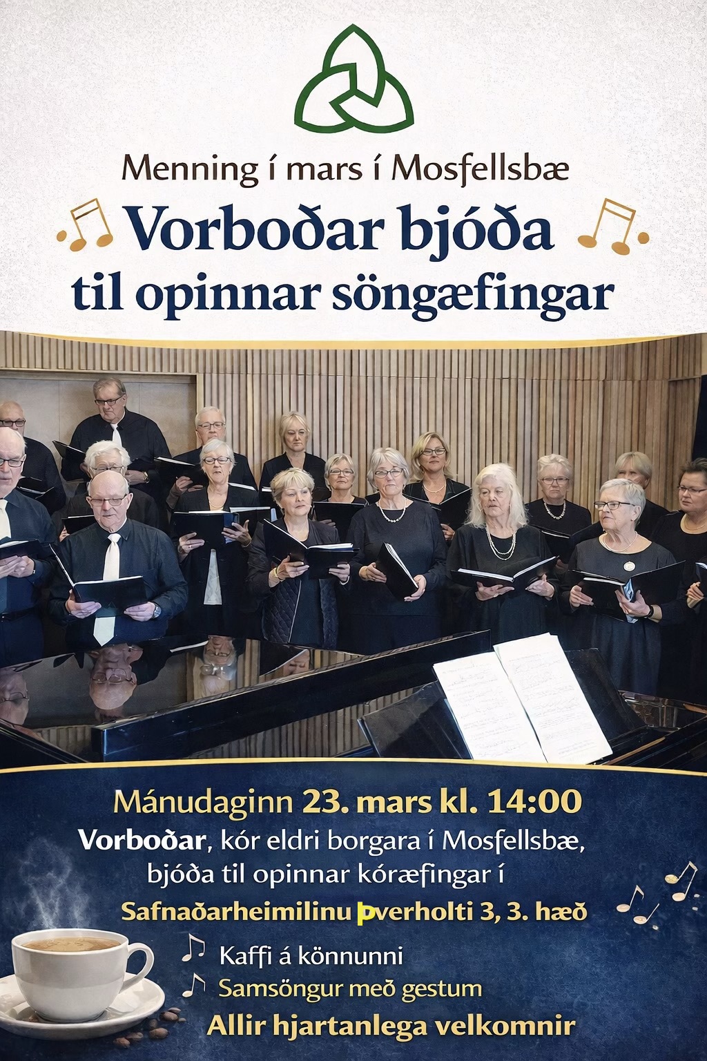 Vorboðar, kór eldri borgara í Mosfellsbæ bjóða til opinnar kóræfingar í Safnaðarheimilinu Þverholti 3, 3.hæð.
