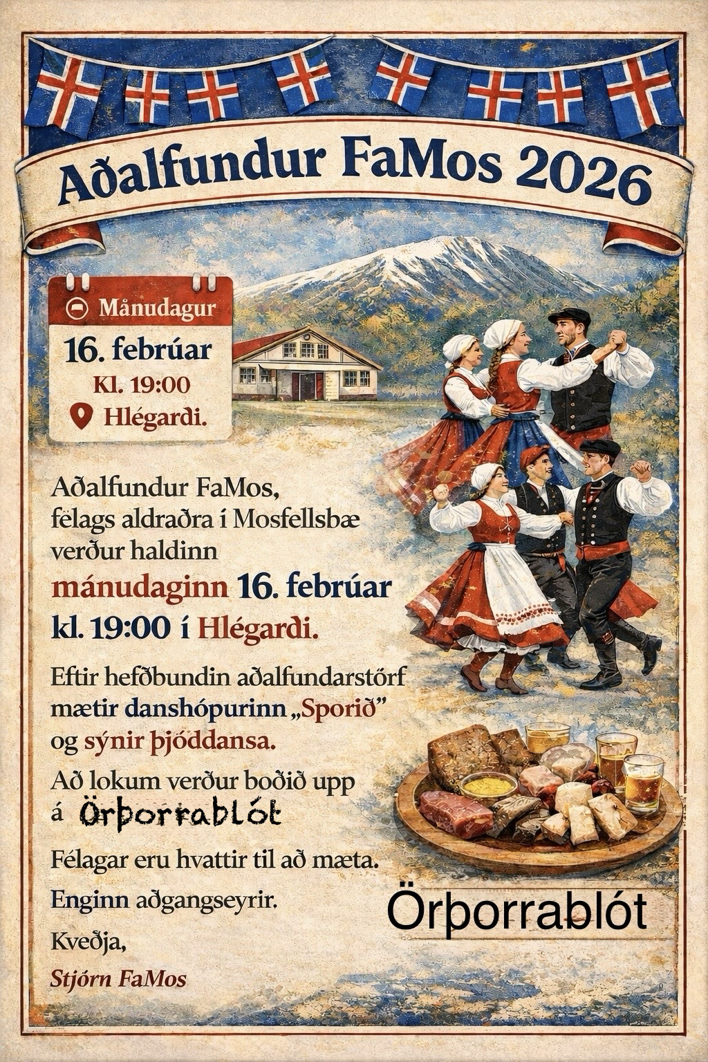 Eftir hefðbundin aðalfundarstörf mætir danshópurinn “Sporið” og sýnir þjóðdansa. Að lokum verður boðið upp á örþorrablót.