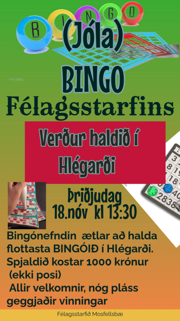 Bingónefndin boðar til flottasta Bingósins í Hlégarði. Spjaldið kostar 1000 krónur (ekki posi). Allir velkomnir, nóg pláss, géggjaðir vinningar.
