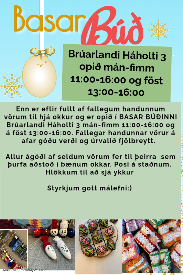 Enn er eftir fullt af fallegum handunnum vörum hjá okkur í Basar búðinni Brúarlandi Háholti 3. Opið mánudaga - fimmtudaga kl. 11:00 - 16:00 og á föstudögum kl. 13:00 - 16:00. Fallegar handunnar vörur á góðu verði.