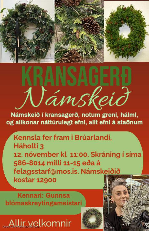 Námskeið í kransagerð fer fram í Brúarlandi, Háholti 3 kl. 11:00 þann 11. nóvember. Námskeiðið kostar kr. 12.900.