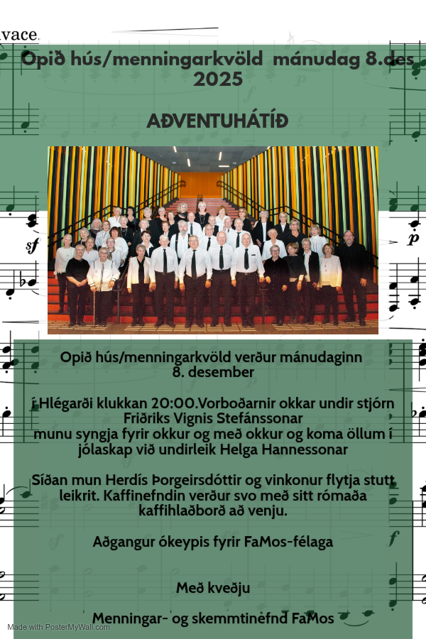 Opið hús / menningarkvöld verður mánudaginn 8. desember í Hlégarði kl. 20:00. Vorboðarnir syngja, Herdís Þorgeirsdóttir og vinkonur flytja stutt leikrit og kaffinefndin verður með sitt rómaða kaffihlaðborð. Ókeypis aðgangur fyrir FaMos félaga.