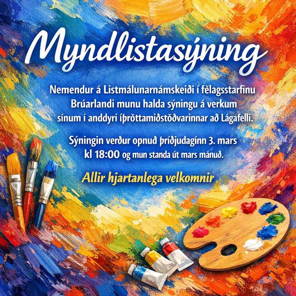 Nemendur á Listmálunarnámskeiði í Brúarlandi munu halda sýningu á verkum sínum í anddyri Íþróttamiðstöðvarinnar Lágafelli.