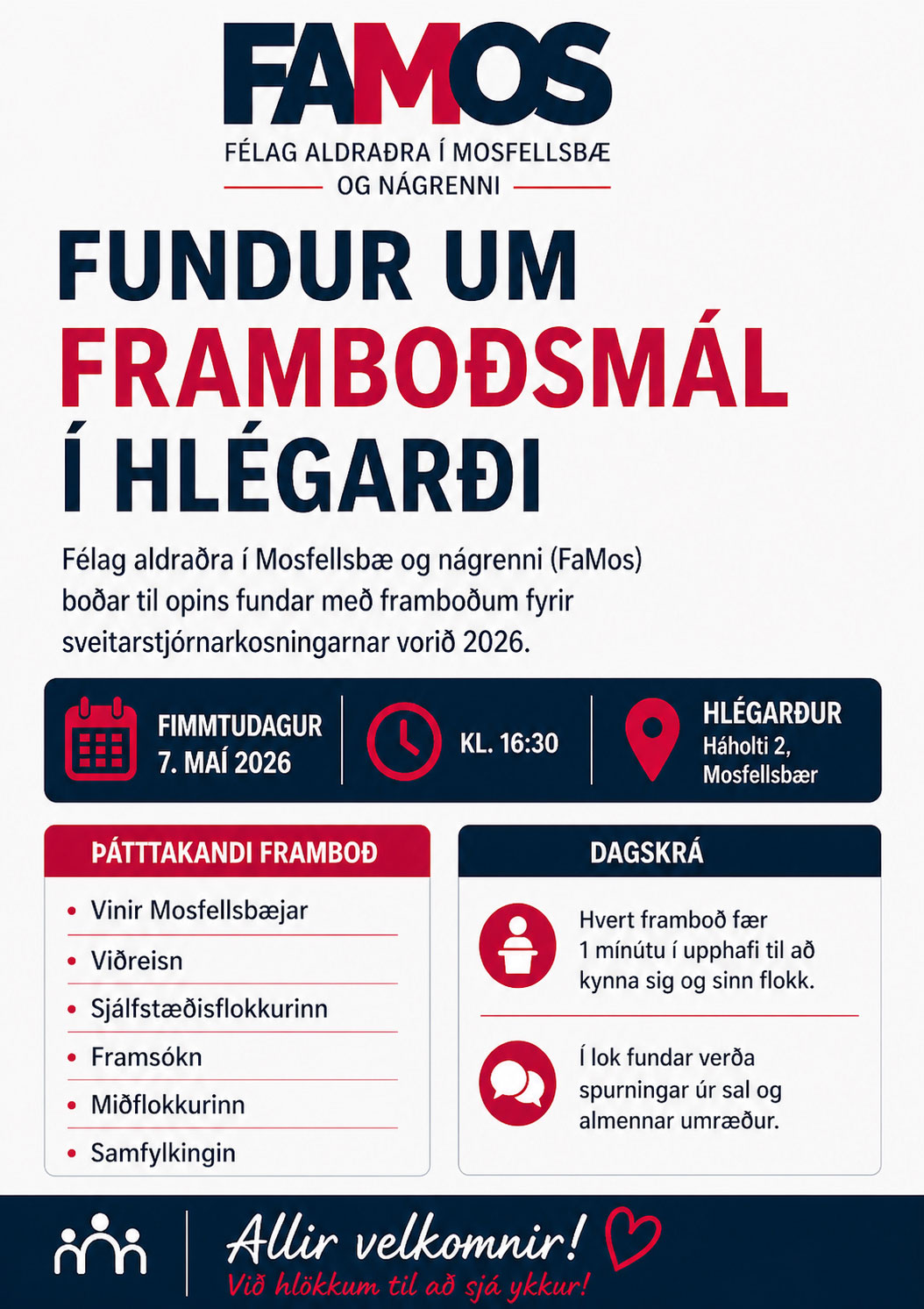 Félag aldraðra í Mosfellsbæ og nágrenni (FaMos) boðar til opins fundar með framboðum fyrir sveitarstjórnarkosningarnar vorið 2026. Þetta er kjörið tækifæri fyrir íbúa til að kynna sér áherslur þeirra flokka sem eru í framboði.