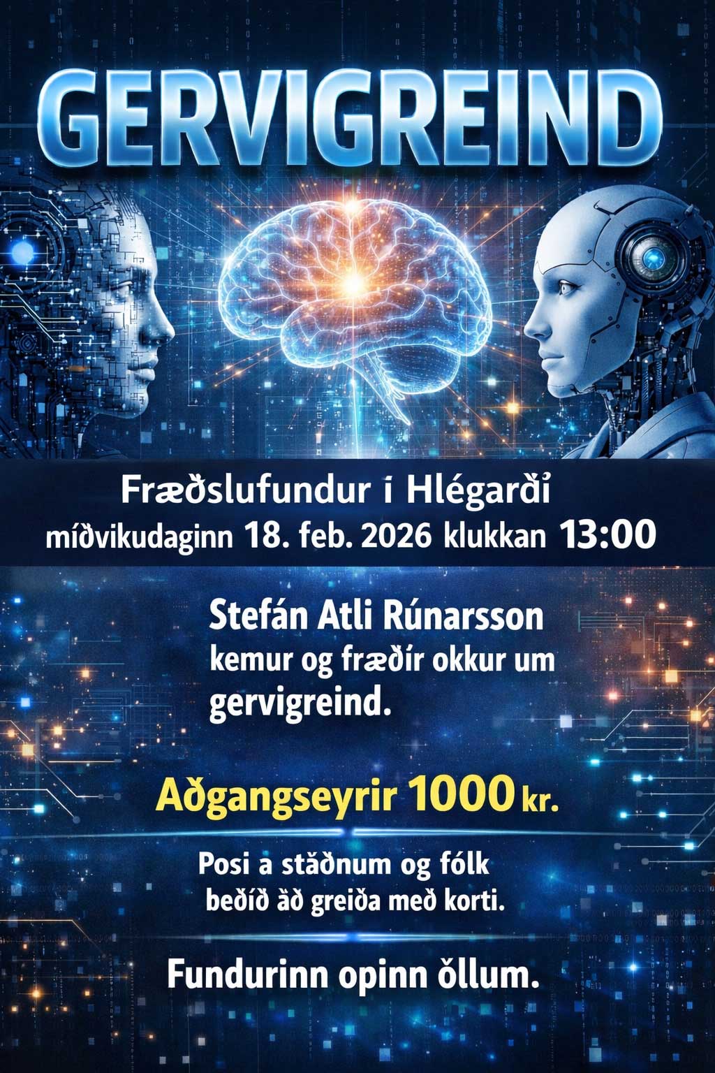 Fræðslufundur í Hlégarði miðvikudaginn 18. feb. 2026klukkan 13:00 Stefán Atli Rúnarsson kemur og fræðir okkur um gervigreind.
