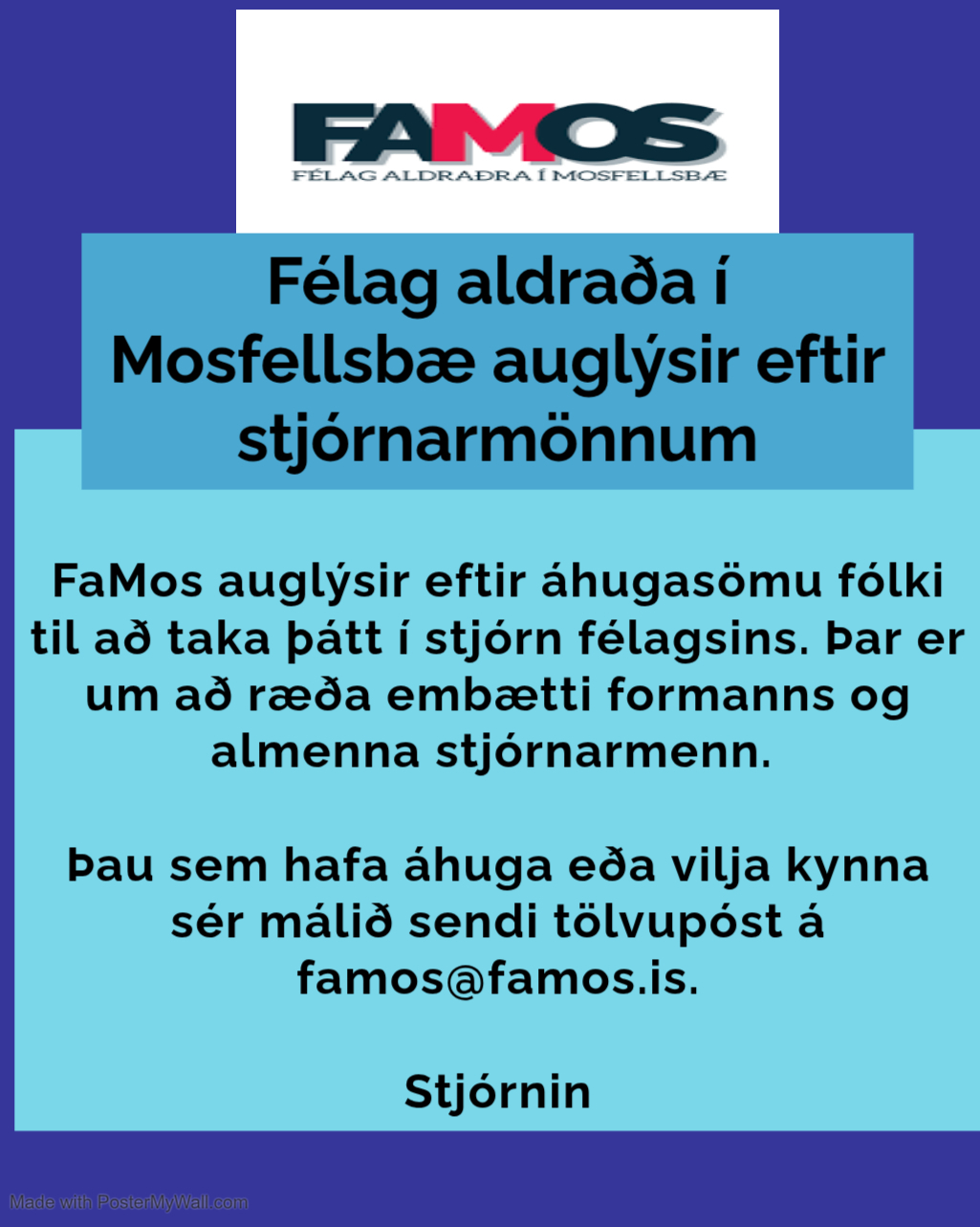 Félag aldraðra í Mosfellsbæ auglýsir eftir stjórnarmönnum. FaMos auglýsir eftir áhugasömu fólki til að taka þátt í stjórn félagsins. Þar er um að ræða embætti formanns og almenna stjórnarmenn. Þau sem hafa áhuga eða vilja kynna sér málið sendi tölvupóst á famos@famos.is. Stjórnin