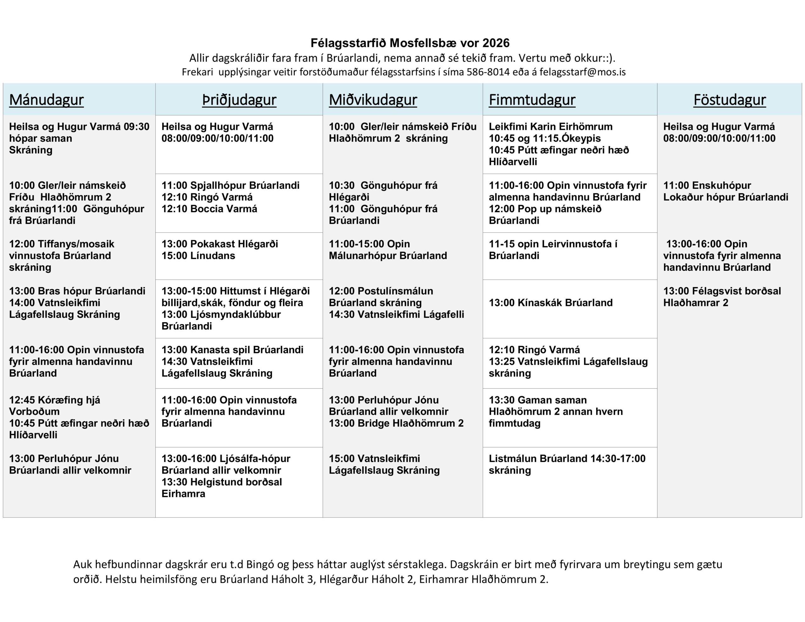 Stundarskrá Stundarskrá félagsstarfsins og FaMos Félagsstarf aldraðra í Mosfellsbæ FaMos og félagsstarf eldri borgara í Mosfellsbæ halda úti sameiginlegri stundarskrá sem inniheldur það sem félagsstarfið býður upp á og það sem FaMos býður uppá. Sækja stundarskrá